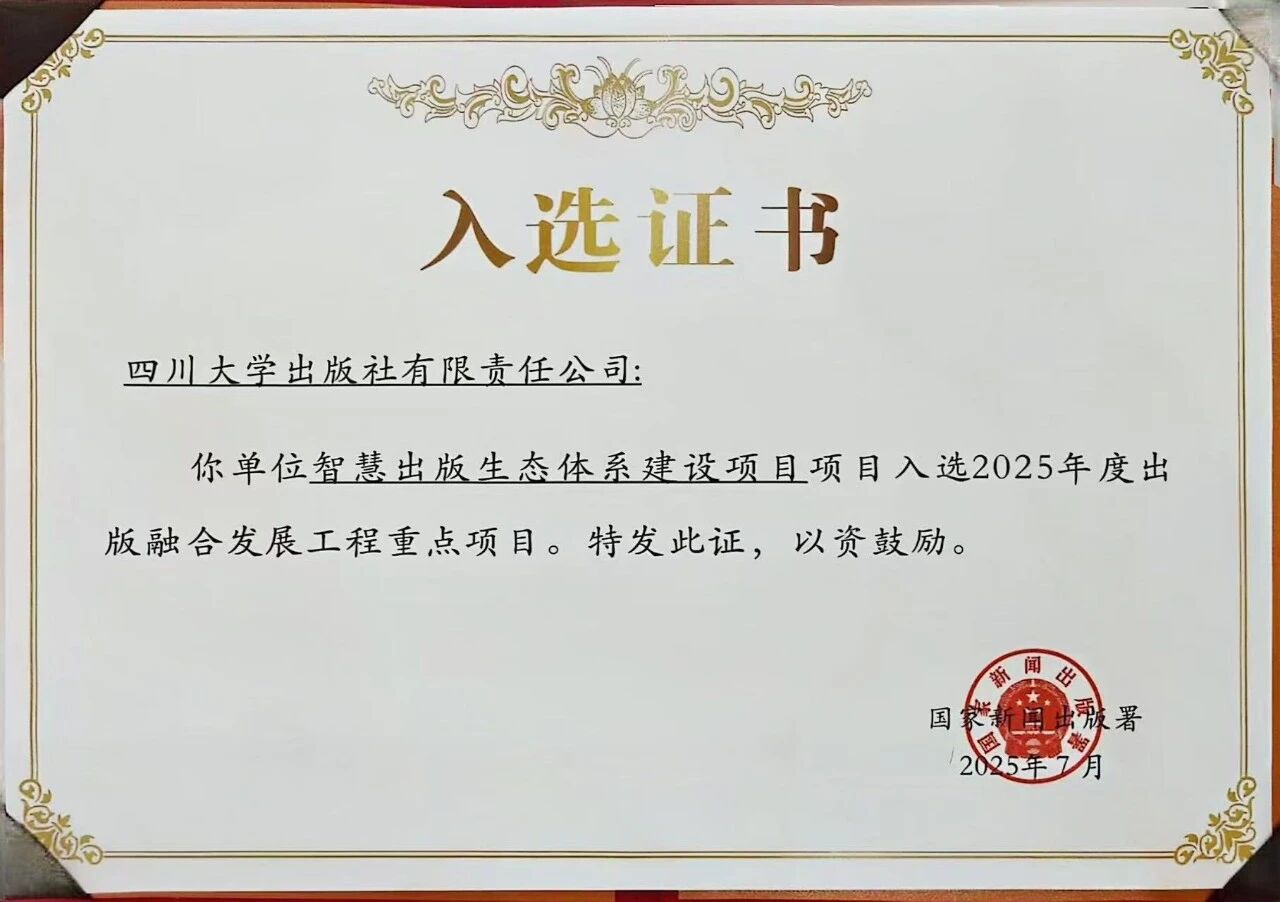 近日,国家新闻出版署公布2025年度出版融合发展工程重点项目入选名单,四川大学出版社申报的“智慧出版生态体系建设项目”成功入选。此次出版融合发展工程从全国245个申报项目中精选40个标杆之作,其中仅6家大学出版社。